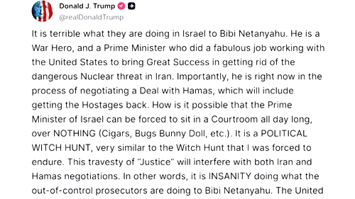 Trump writes a Letter to the Israeli Government begging them to pardon Bibi Netanyahu